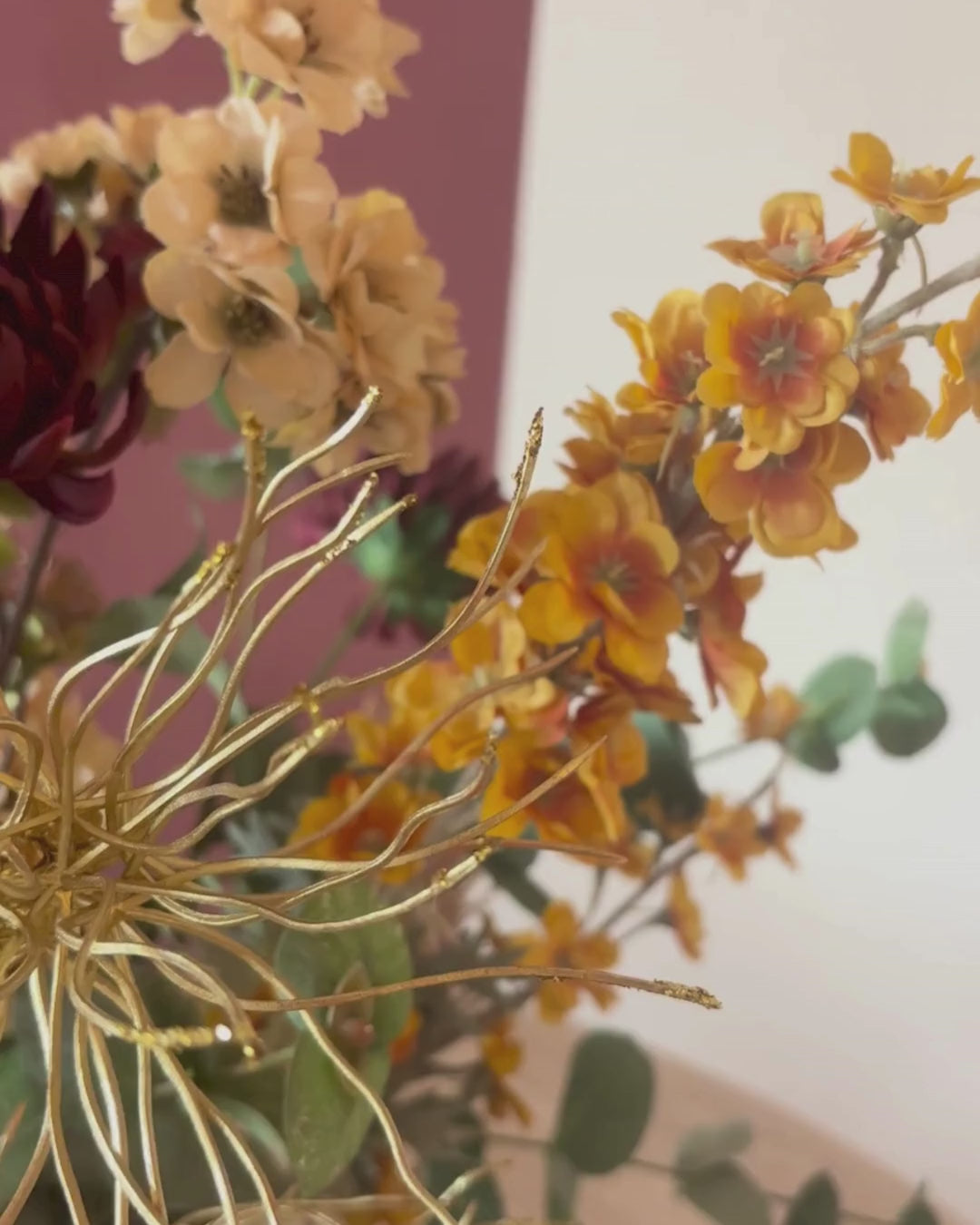 Autumn Glow is een warm en rijk boeket geïnspireerd op de kleuren van de herfst. Gouden tinten, diep oranje en zachte crèmekleuren vloeien moeiteloos samen tot een volle en harmonieuze compositie. De combinatie van bloesemtakken, verfijnde bloemen en natuurlijk groen geeft het boeket een elegante uitstraling met een subtiele, zonnige gloed. Perfect om extra sfeer en warmte in huis te brengen tijdens elk seizoen.